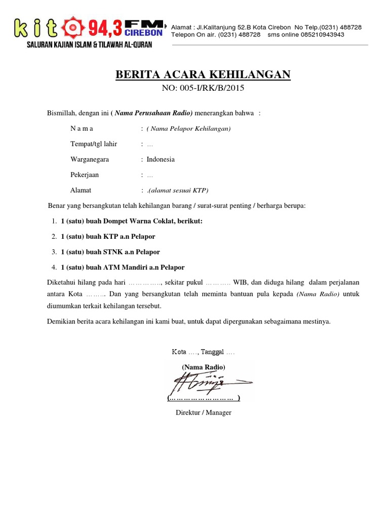 Contoh Surat Berita Acara Kehilangan Barang Perusahaan berupa STNK motor. Berbisnis memang tidak hanya tentang keuntungan di.